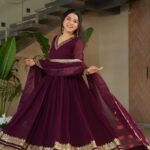 This elegant gown features premium Faux Blooming fabric adorned with intricate embroidery, zari, and sequins work, giving it a rich and graceful appeal. With a flattering V-neckline, full sleeves, and a 3.5-meter flair, it adds a touch of royalty to your look. The 56-inch length and full cotton lining from top to bottom ensure comfort and coverage.
